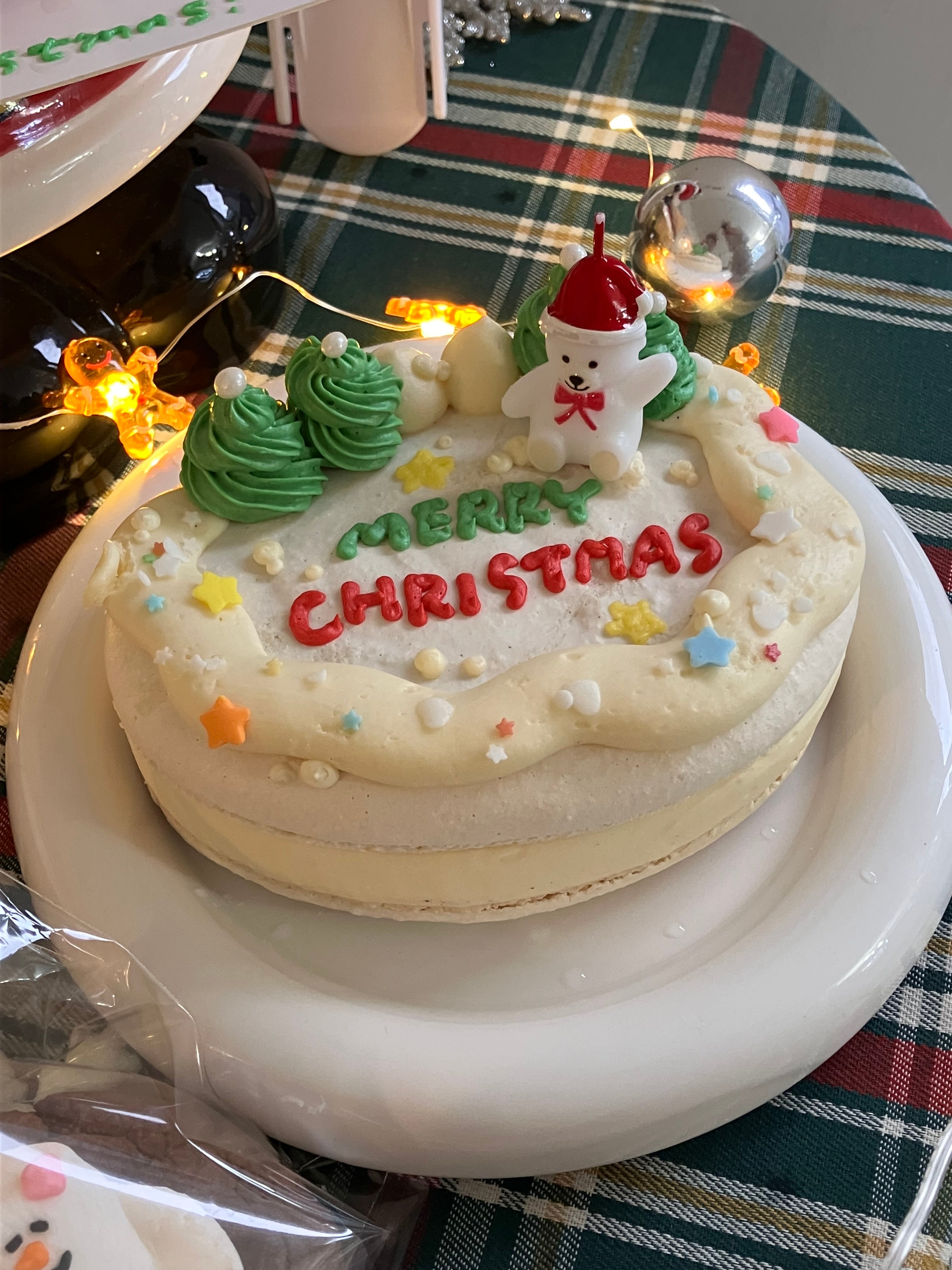 周りのクリームで雪が積もっている様子を表現しており、クリスマスの楽しさを一緒に楽しめるデザインです!シロクマサンタのキャンドルが、見た目にも心を和ませ、クリスマスの雰囲気を引き立てます。